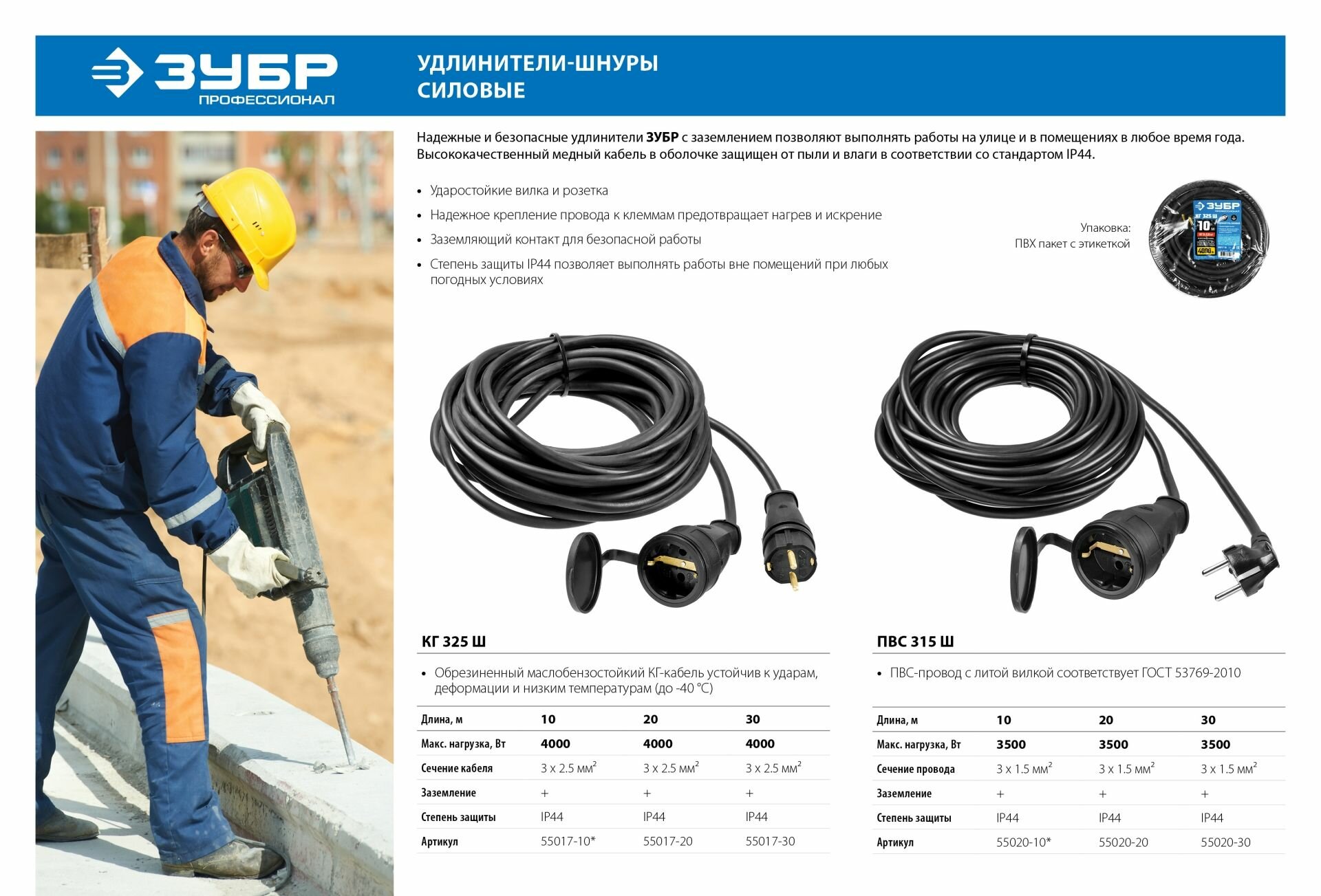 ЗУБР КГ-325-Ш, КГ, 3 х 2.5 мм2, 30 м, IP44, 4000 Вт, силовой удлинитель-шнур, Профессионал (55017-30)