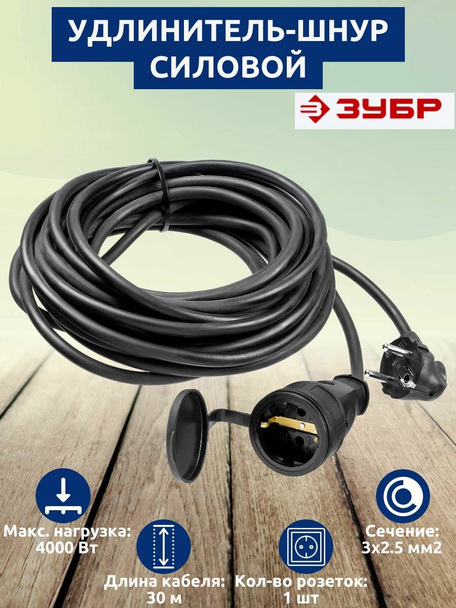 Удлинитель силовой Зубр 55017-30 3x2.5кв.мм 1розет. 30м КГ 20A без катушки черный 55017-30