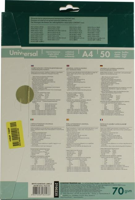 Бумага самоклеящаяся Lomond A4, 189 делений (25,4х10), 70 г/м2, 50 листов 2100235