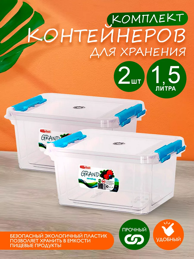 Контейнер elfplast "Grand" для хранения пластиковый с крышкой 1,5 л 2 шт, (прозрачный) 547