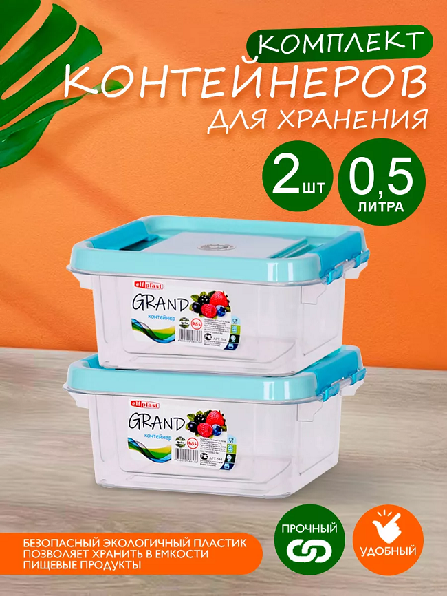 Контейнер elfplast "Grand" для хранения пластиковый с крышкой 0,5 л 2 шт, (прозрачный) 544