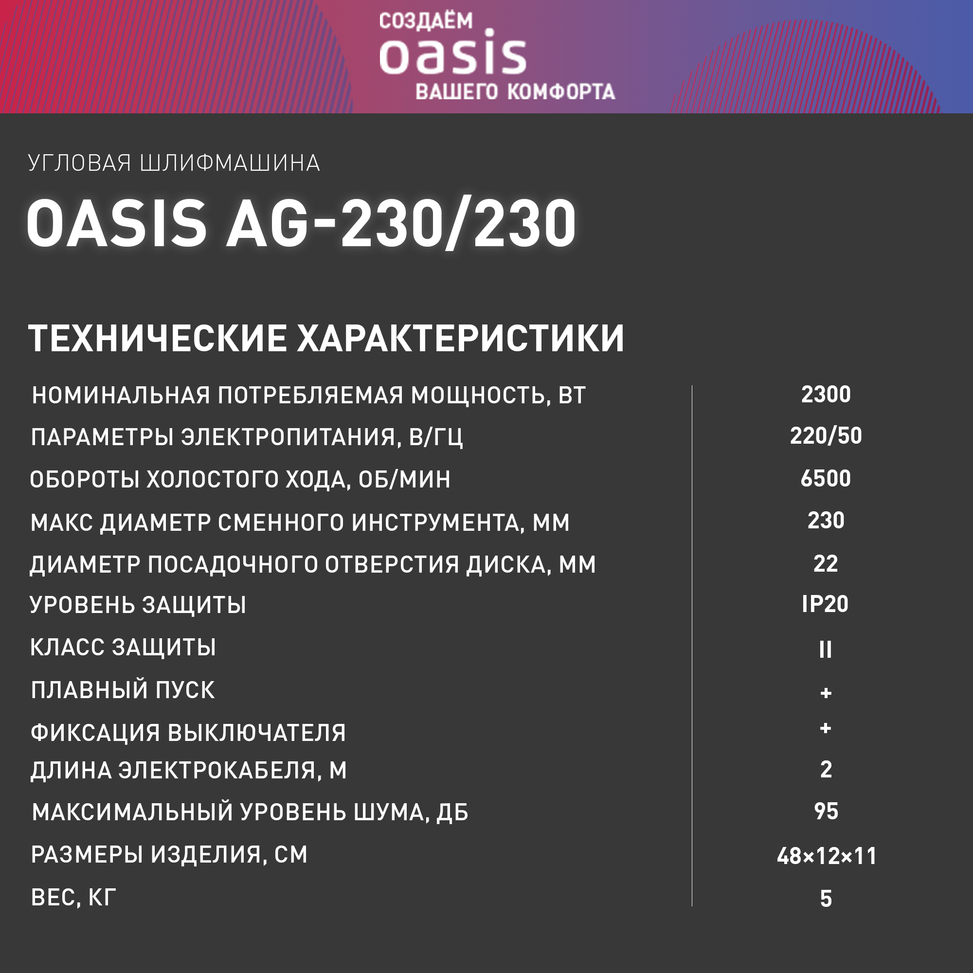 УШМ 230 мм Oasis AG-230/230 (230мм, 2300Вт, 6500об/мин.)
