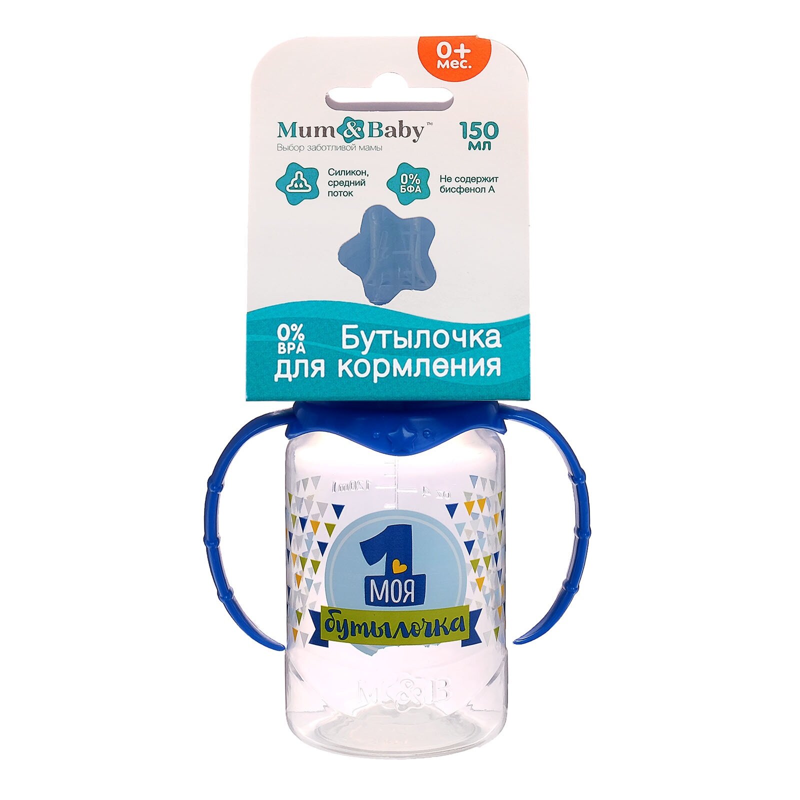 Бутылочка для кормления M&B "Моя первая бутылочка" с ручками, классическое горло, от 0 мес, 150 мл, синий
