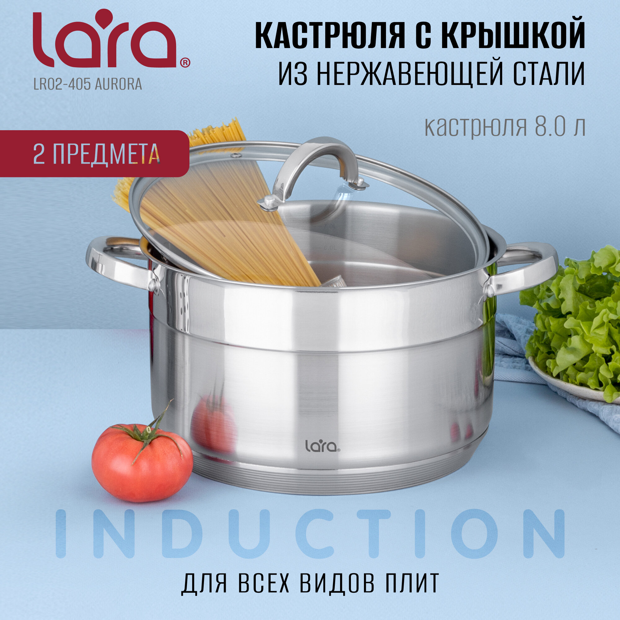 Купить Кастрюля из нержавеющей стали LARA LR02-405 AURORA/ 8.0 л/ стальные ручки/ капсулированное/ индукционное дно/ крышка с паровыпуском