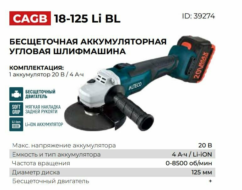 Бесщёточная аккумуляторная угловая шлифмашина ALTECO CAGB 18-125 Li BL 39274 интересное:
