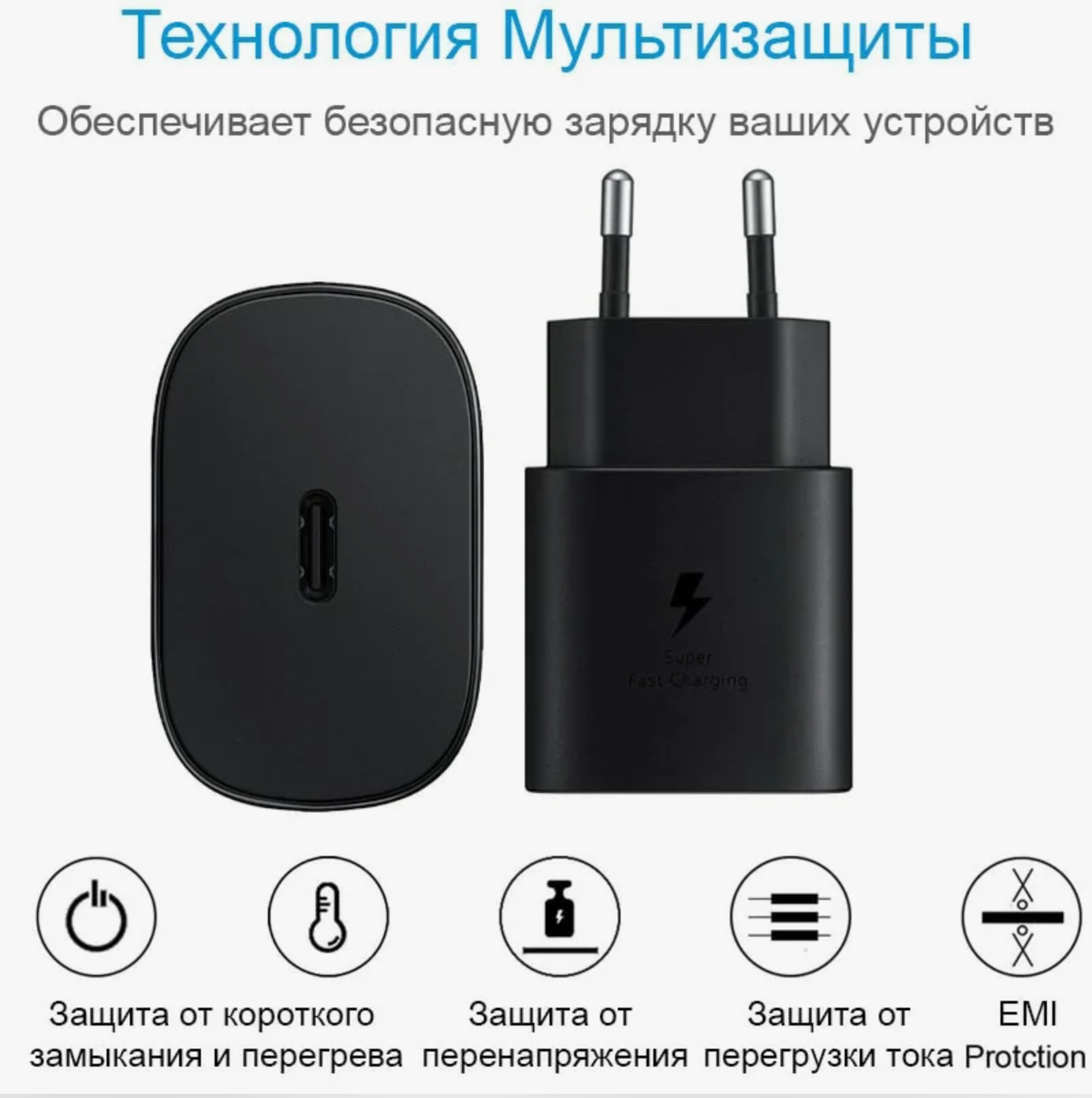 Супер быстрая зарядка для Samsung, USB-C, 25W (3А), черная