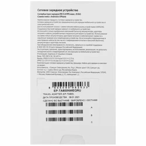 Зарядное устройство 25W Samsung TA800 Очень быстрая зарядка
