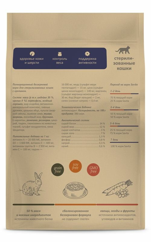 Корм SAVITA беззерновой корм для стерилизованных кошек с кроликом (2 кг)