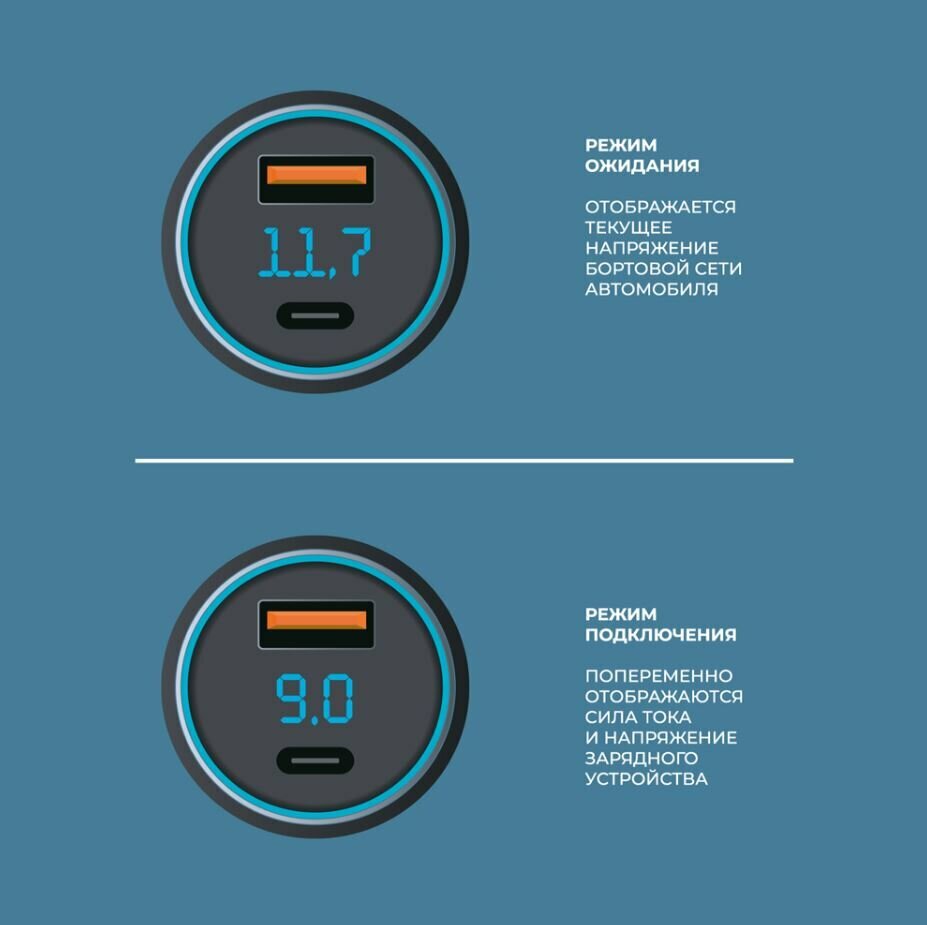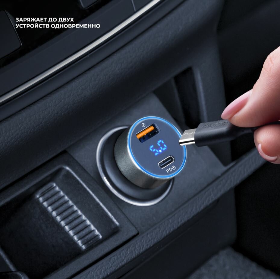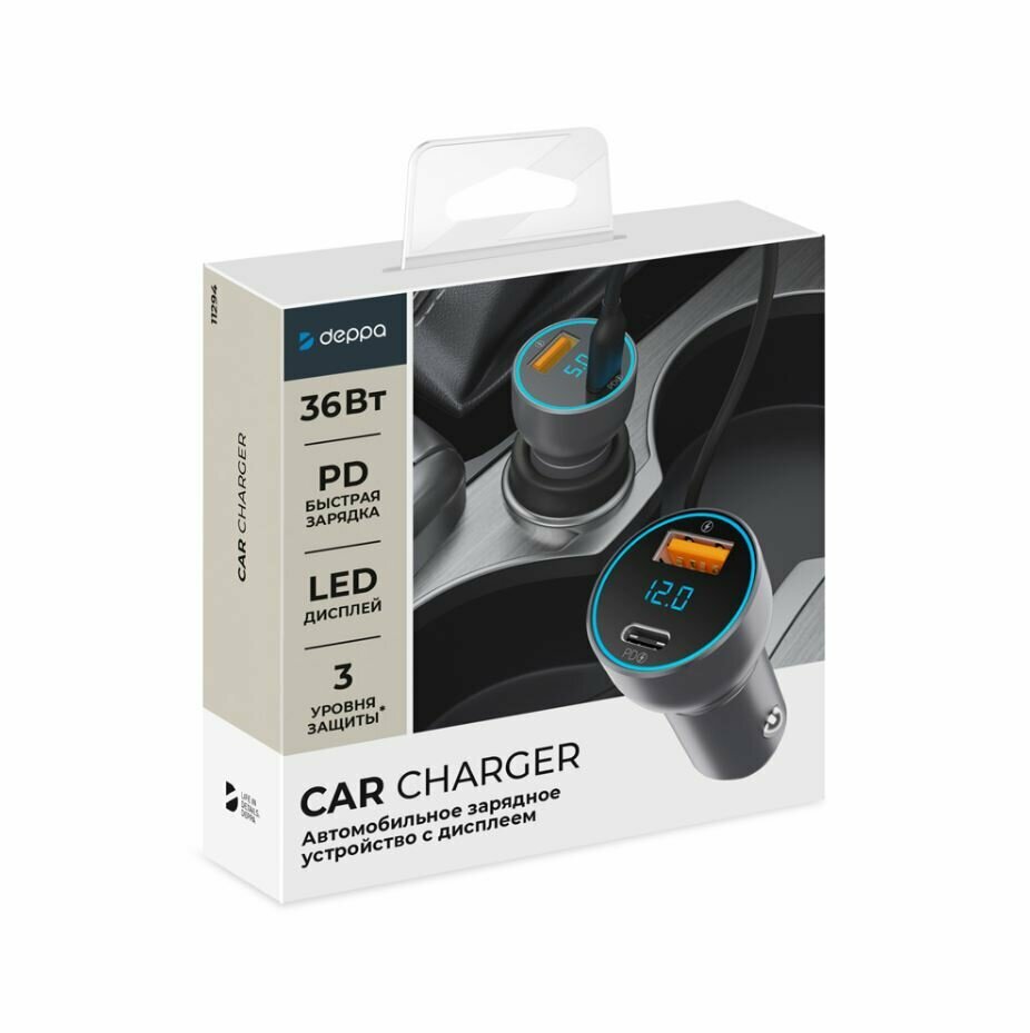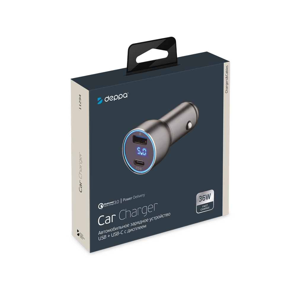 Автомобильное зарядное устройство USB-A + USB-C, PD, QC3.0, 36W, дисплей, алюминий, графит, DEPPA