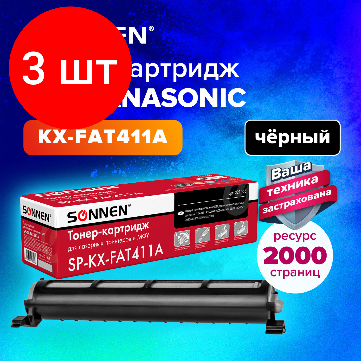 Купить Комплект 3 шт, Тонер-картридж SONNEN (SP-KXFAT411A) для PANASONIC KX-MB1900/2000/2020/2030, высшее качество, ресурс 2000 стр., 321056