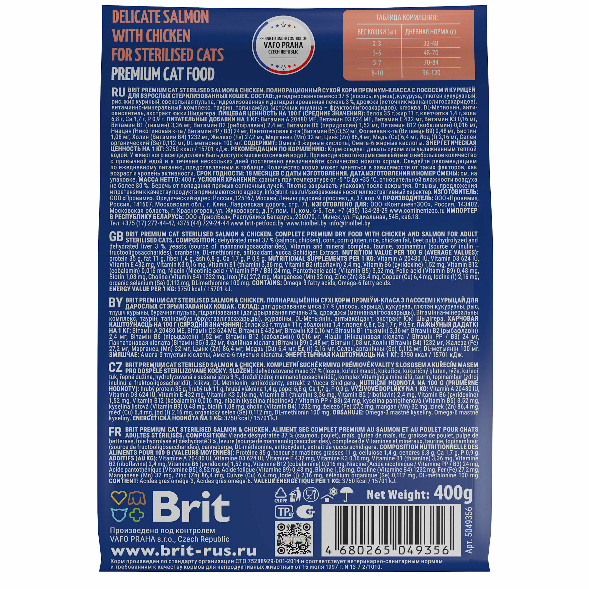 Корм BRIT 400гр для стерилизованных кошек с лососем и курицей Premium Cat Sterilized