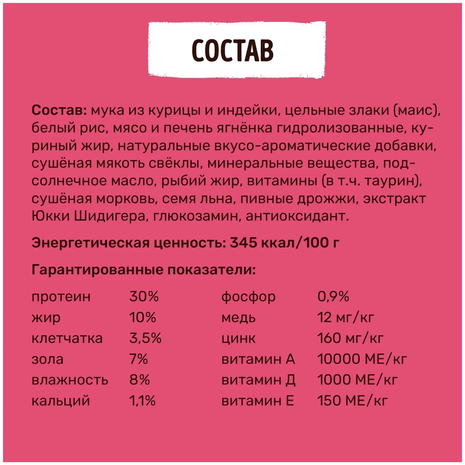 | Состав | мука из курицы и индейки, цельные злаки (маис), белый рис, мясо и печень ягнёнка гидролизованные, куриный жир, натуральные вкусо-ароматические добавки, сушёная мякоть свёклы, минеральные вещества, подсолнечное масло, рыбий жир, витамины (в т.ч. таурин), сушёная морковь, семя льна, пивные дрожжи, экстракт юкки Шидигера, глюкозамин, антиоксидант |
