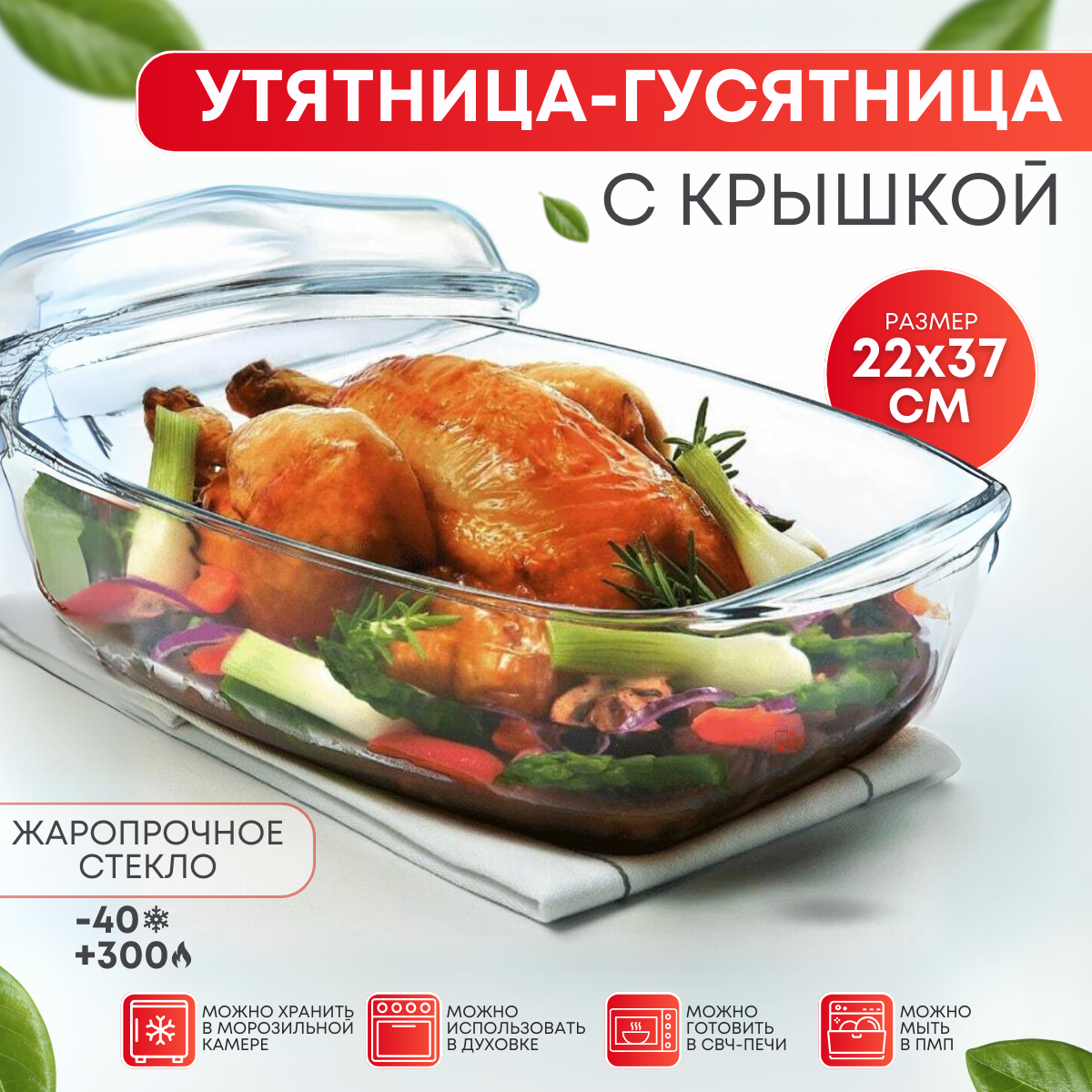 Утятница - гусятница из жаропрочного стекла, прямоугольная Pyrex 6,5 л O CUISINE 37х22см с крышкой, блюдо, стеклянная форма, для запекания, для выпечки