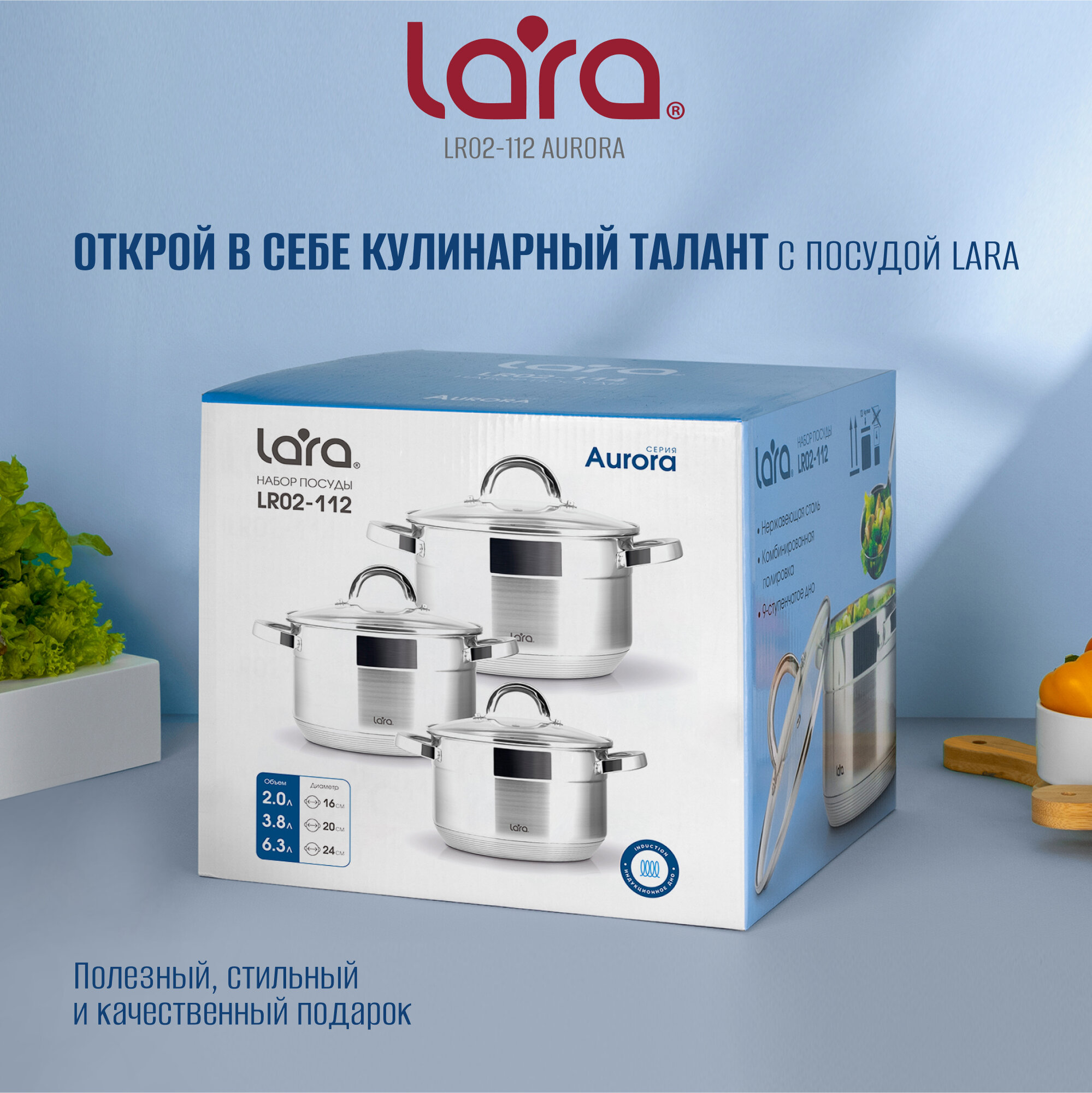 СохранитьНабор кастрюль из нержавеющей стали LARA LR02-112 AURORA/ 2 л + 3.8 л + 6.3 л/ для всех видов плит/ 3 предмета интересное:
