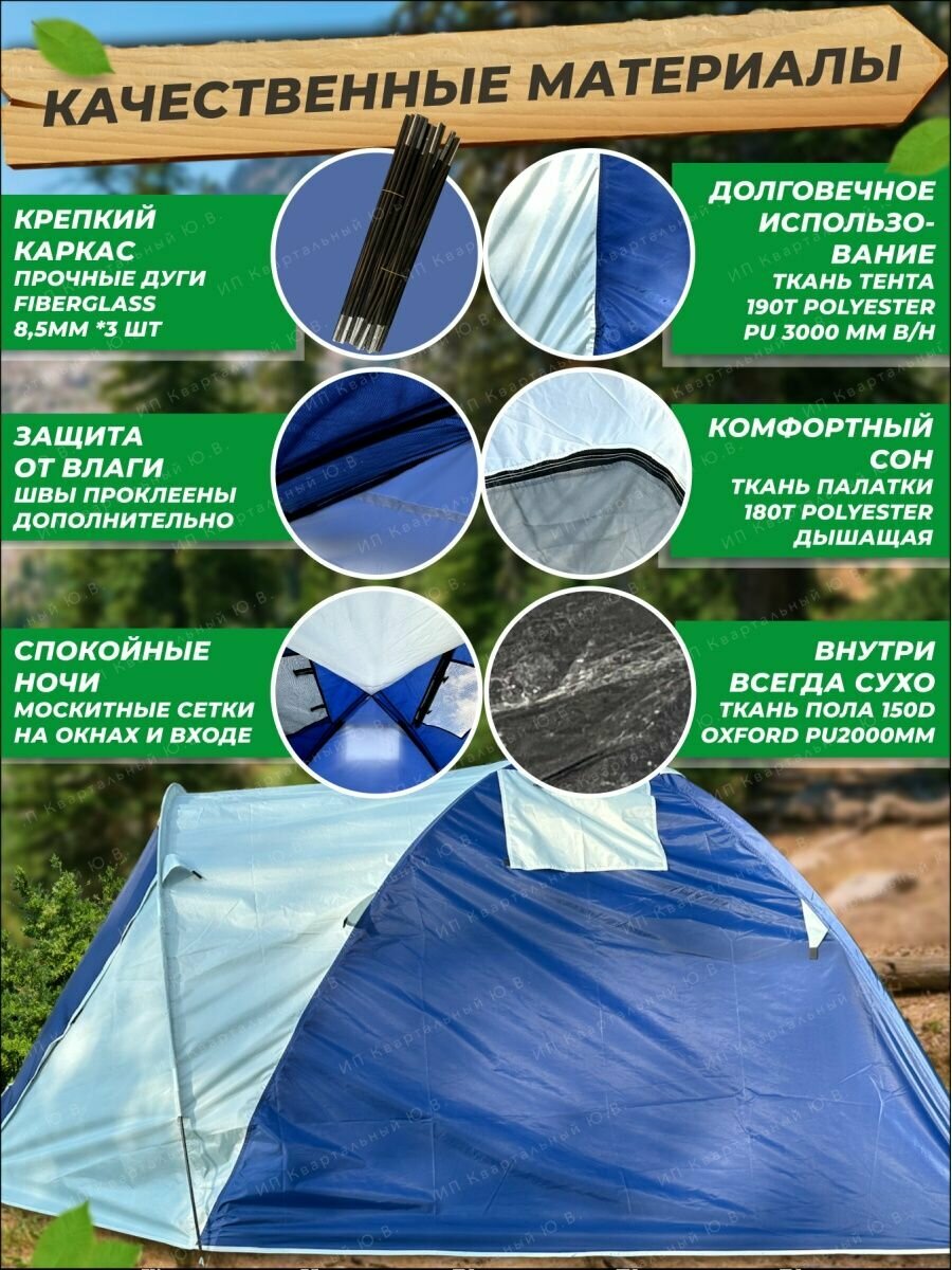 | Особенности | УФ-защита / вентиляционные отверстия / ветрозащитная/снегозащитная юбка / внутренние карманы / внутренняя палатка / навес / окна / проклеенные швы / тент |