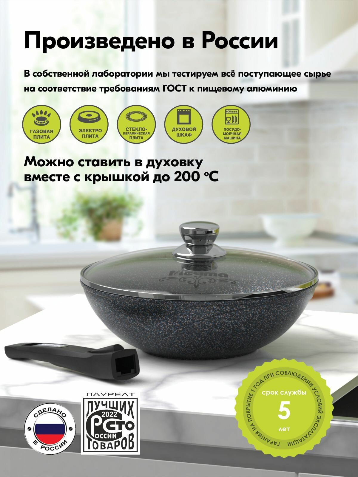 Сковорода ВОК "Мечта" 28см Гранит с антипригарным покрытием со съемной ручкой и крышкой, можно мыть в посудомоечной машине