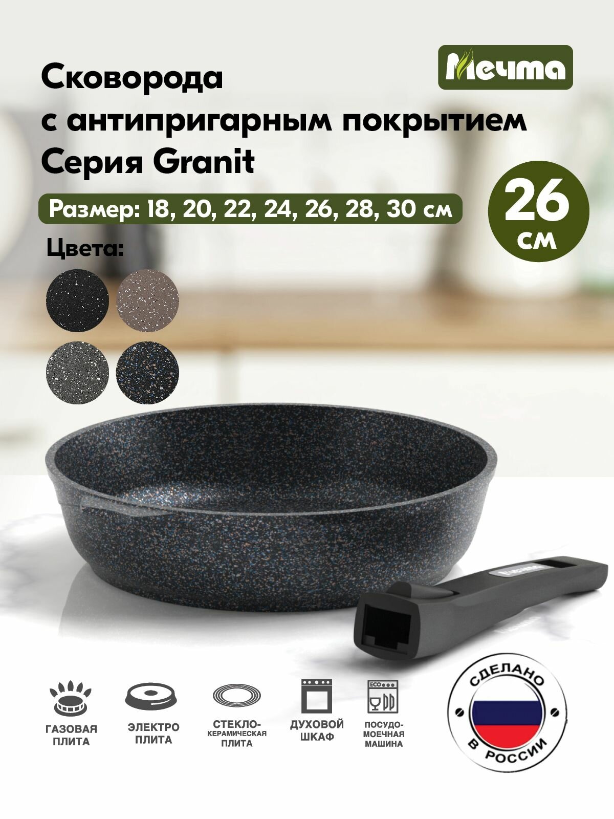 Сковорода Мечта 18 см Гранит с антипригарным покрытием со съемной ручкой, НЕ индукционная