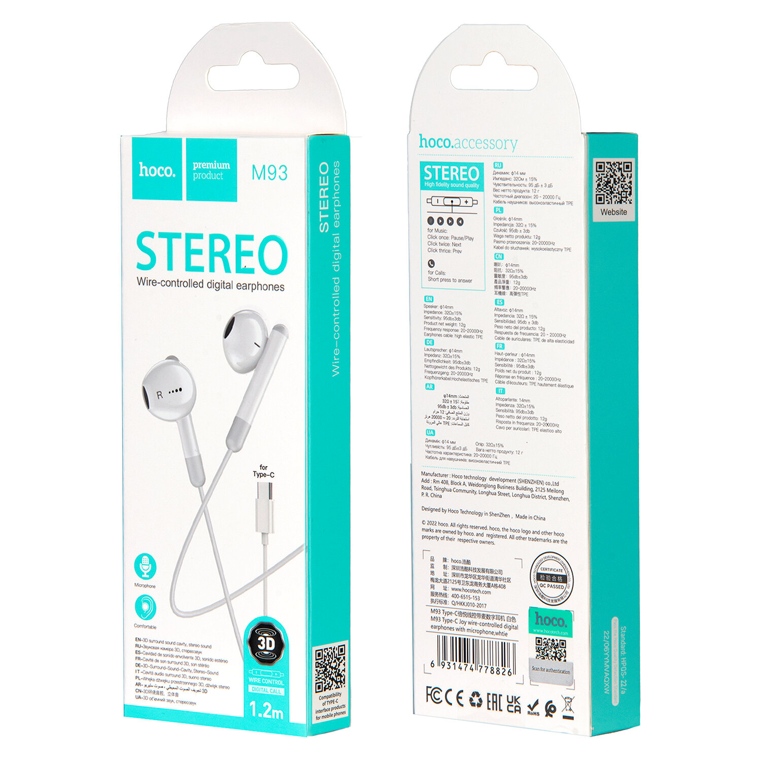 Hoco M93 Type-c joy wire-controlled digital earphones with microphone white
