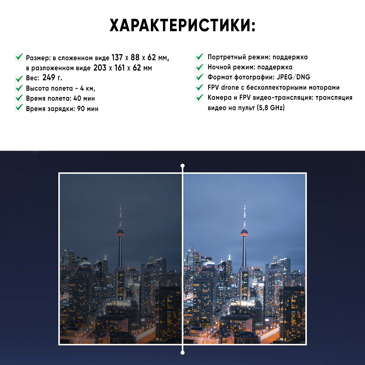 | Особенности | бесколлекторный двигатель / вертикальная съемка / возврат домой / интеллектуальная батарея / ночной режим / сопротивление ветру |