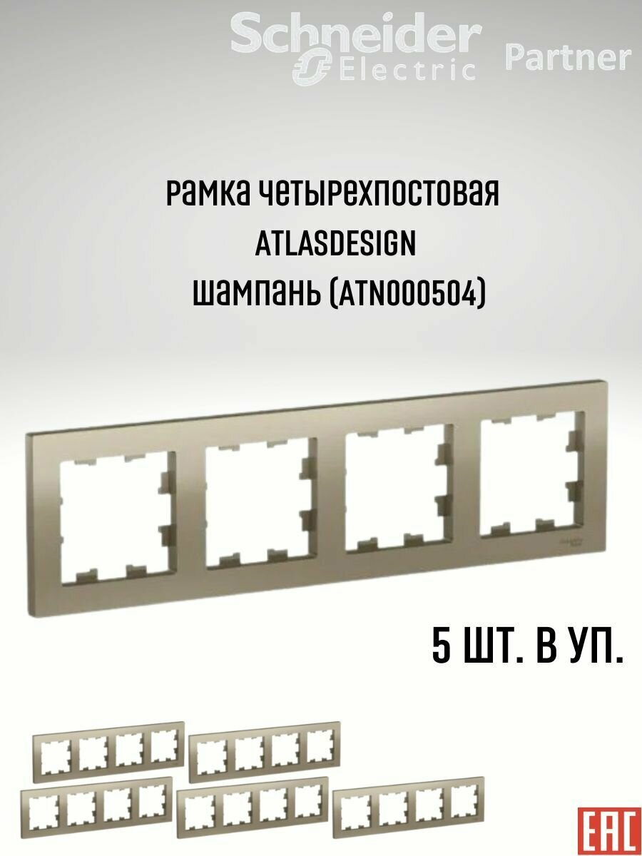 Купить Рамка для розетки выключателя четверная Schneider Electric (Systeme Electric) Atlas Design Антибактериальное покрытие шампань ATN000504 5шт