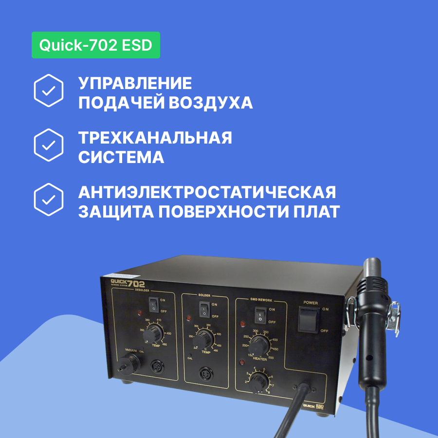 Купить QUICK702 ESD, паяльный комплекс 3 в 1 термофен + керамический паяльник + оловоотсос