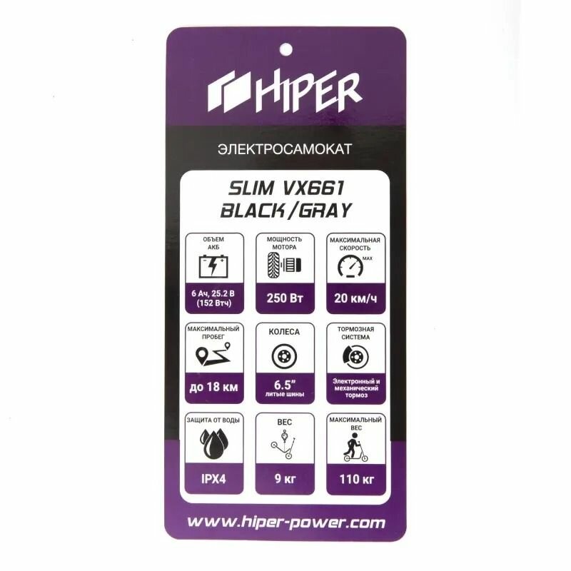 HIPER Электросамокат HIPER Slim VX901 Black, колеса 8" шины литые шины, 250 Вт мотор, батарея 5,2Ач(36В,188Втч), до 24кмч, черный