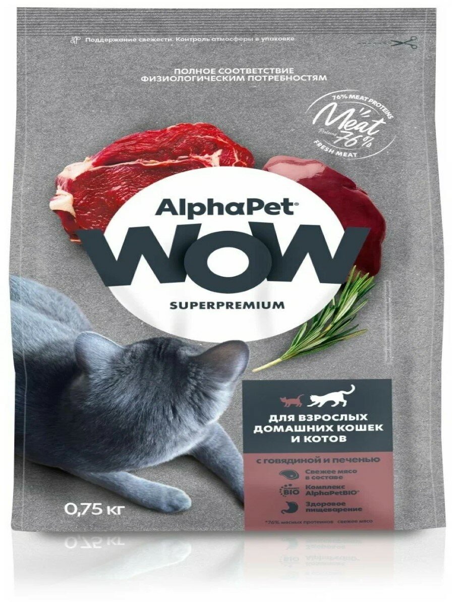 Корм сухой Alphapet WOW Superpremium с говядиной и печенью для взрослых домашних кошек и котов, 750 г