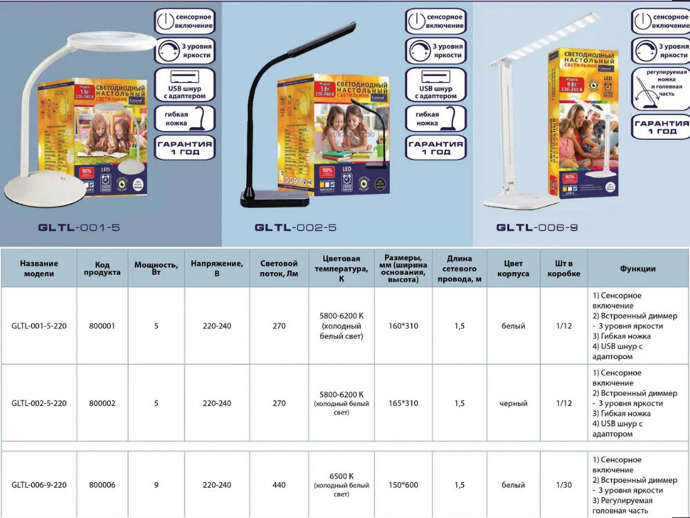 Светильник настольный LED GLTL-006-9-220 9W белый сенсорное включение, диммер General