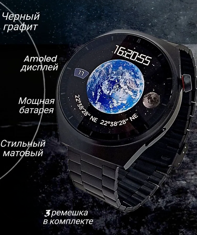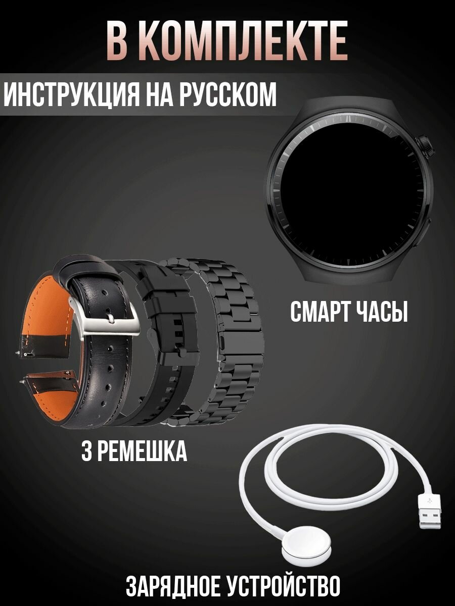 Смарт часы мужские, умные часы наручные электронные, металлический браслет для часов, 3 вида ремешка, беспроводная зарядка, bluetooth, круглые, черный интересное:
