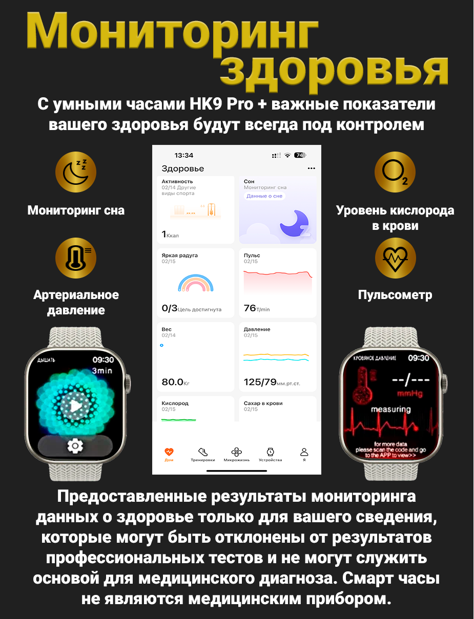 | Мониторинг | калорий, пульса, сна, температуры тела, тонометр, уровня кислорода в крови, уровня сахара в крови, физической активности, частоты дыхания |