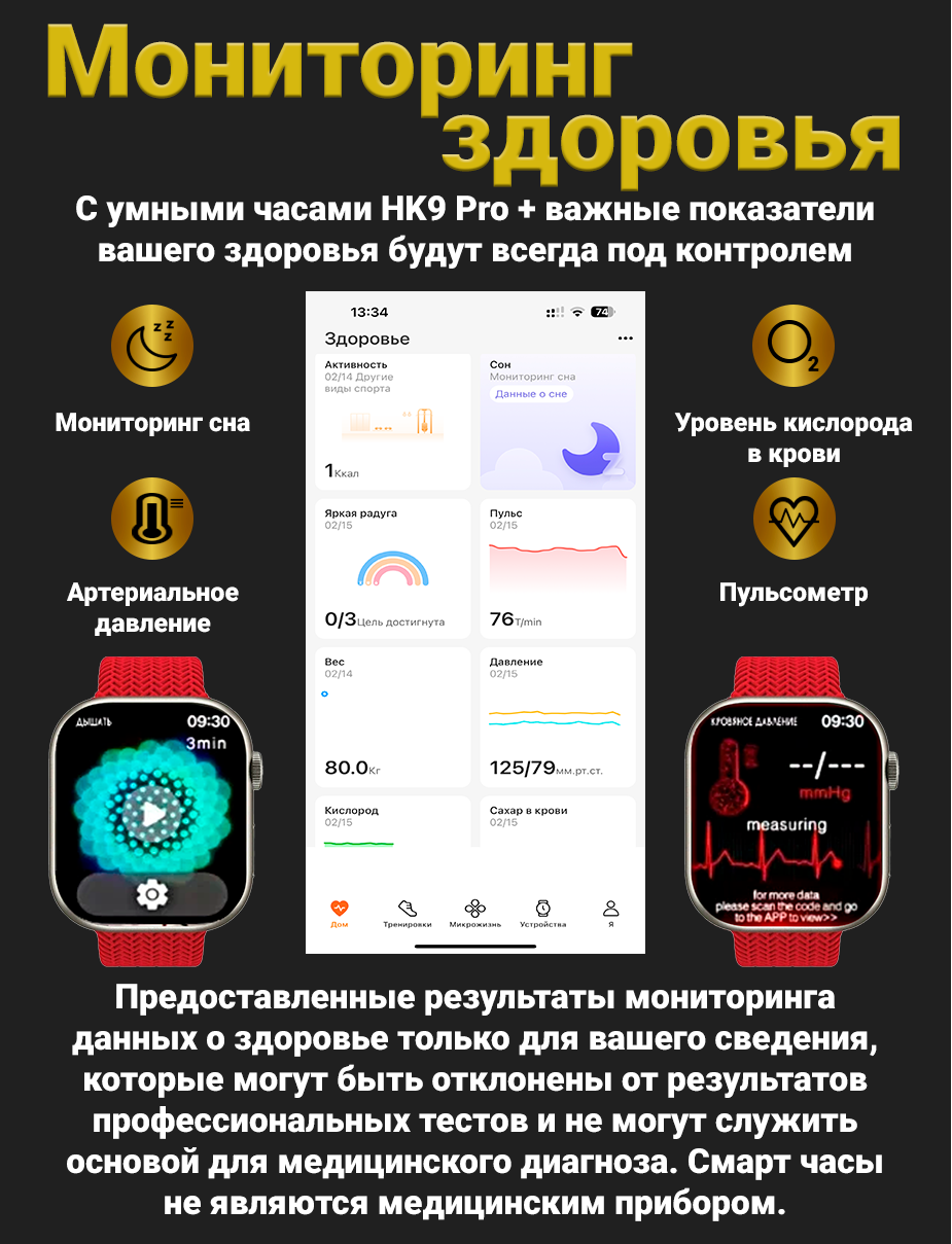 | Мониторинг | калорий, пульса, сна, температуры тела, тонометр, уровня кислорода в крови, уровня сахара в крови, физической активности, частоты дыхания |
