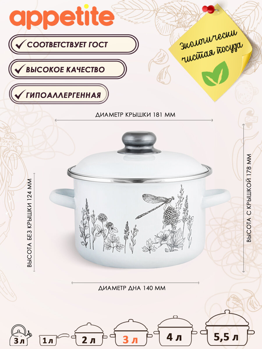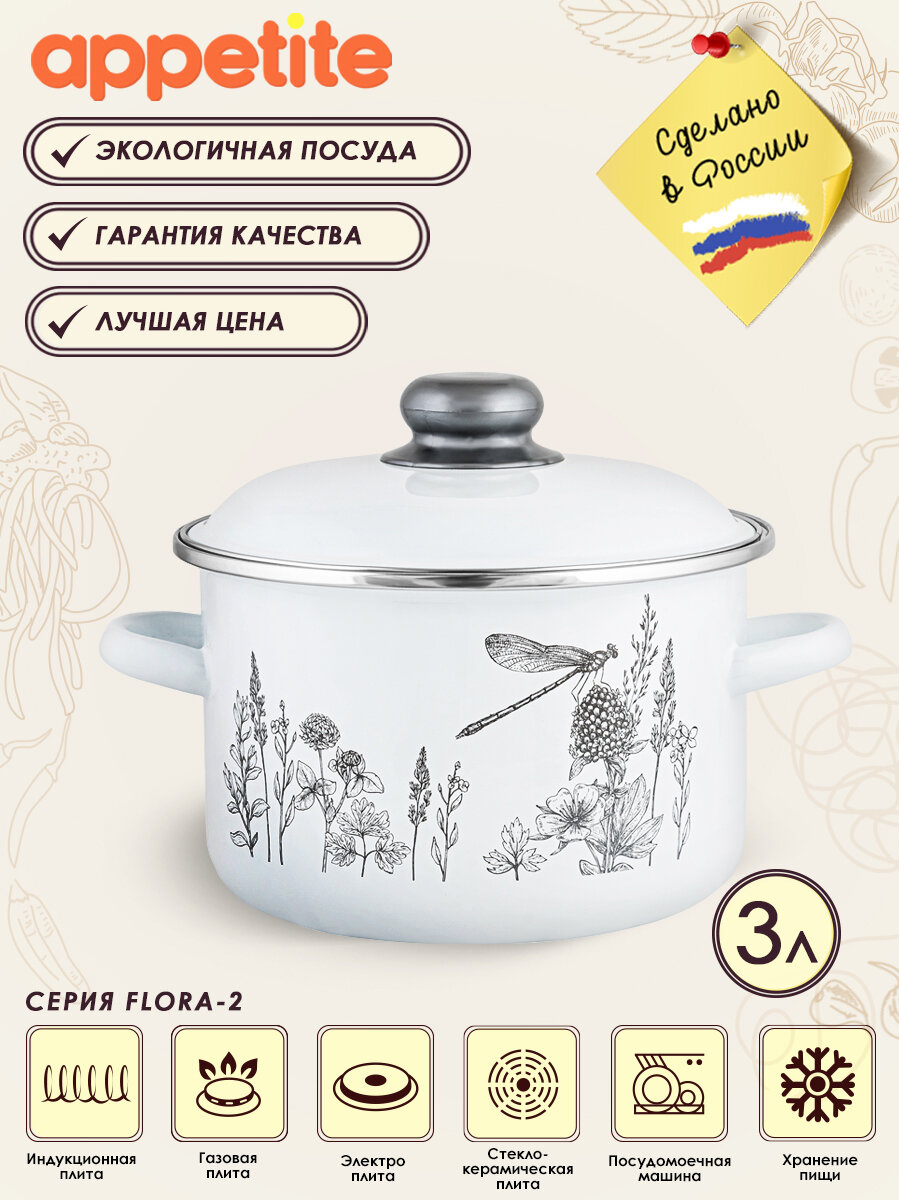 Кастрюля эмалированная Appetite FLORA-2, с крышкой, 3 л