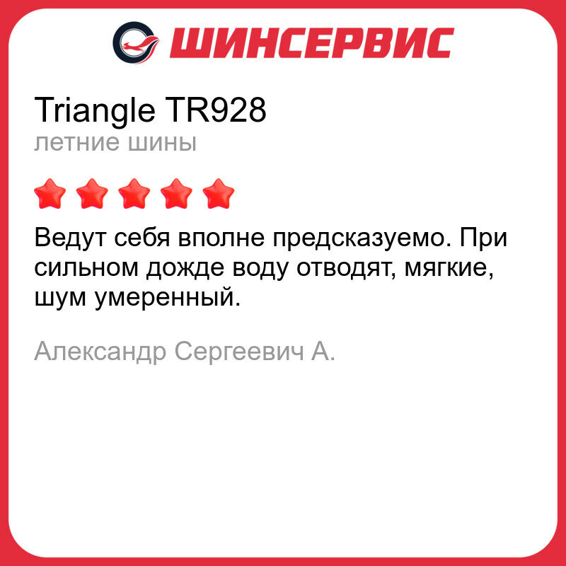 | Отзыв: | Купил Триангл 928 R16 215 65 по 2500р за шину, до этого стоял Hankook, и сразу же отправился их тестировать на КАД, могу сказать что до 160 км/ч они себя показали с лучшей стороны, шума нет, дорогу держат отлично, в дождь пока не ездил, ну думаю они тоже будут на высоте, доволен покупкой! |
