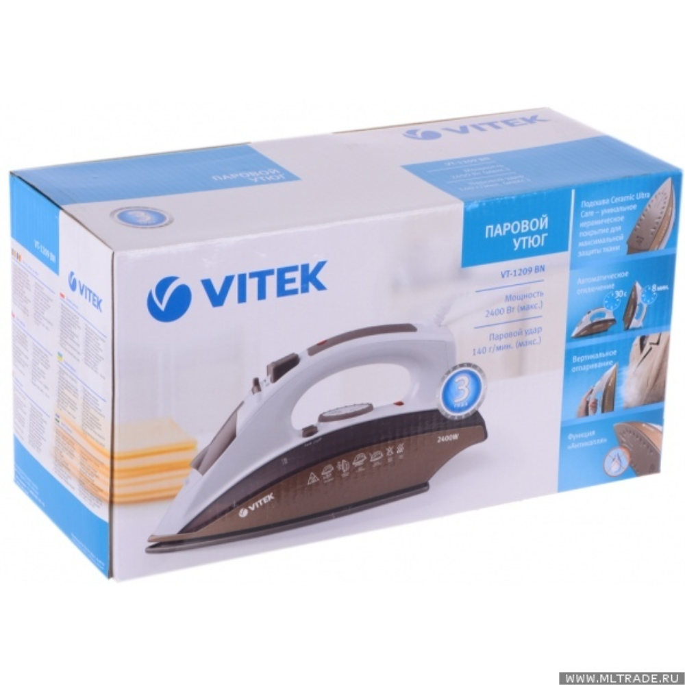 Купить Утюг VITEK VT-1209 BN Мощность 2400Вт. Материал подошвы керамика Ceramic UltraCare. Паровой удар 140 г/мин. Регулировка подачи пара 35 г/мин. Функция разбрызгивания. Автоматическое отключение. Вертикальное отпаривание. Защита от накипи. Противокапельная с