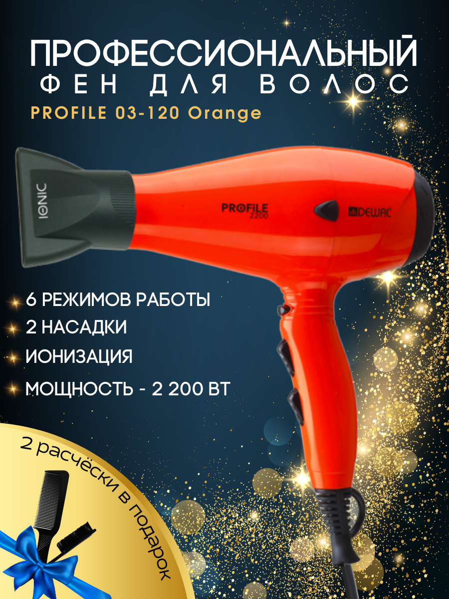 Фен DEWAL PROFILE 2200, оранжевый, вес 570гр, 2200Вт, ионизация, 2 насадки, провод 3м 03-120 Orange