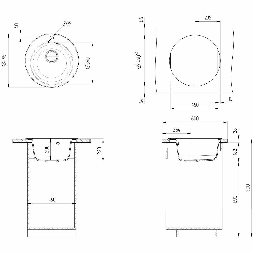 Мойка Ulgran, мрамор, U-405-309, (D-495*190 мм), темно-серый, сифон и сливная арматура
