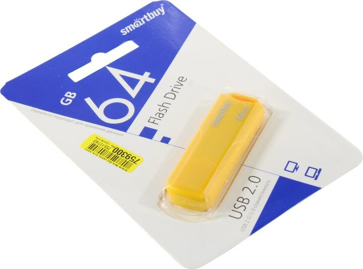 Флешка Smartbuy 64GBCLU-Y, 64 Гб, USB2.0, чт до 25 Мб/с, зап до 15 Мб/с, желтая