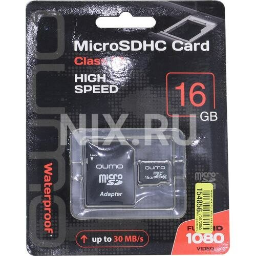 Карта памяти microSDHC Qumo 16 Гб класс 10 FULL HD 1080 Video - с адаптером SD