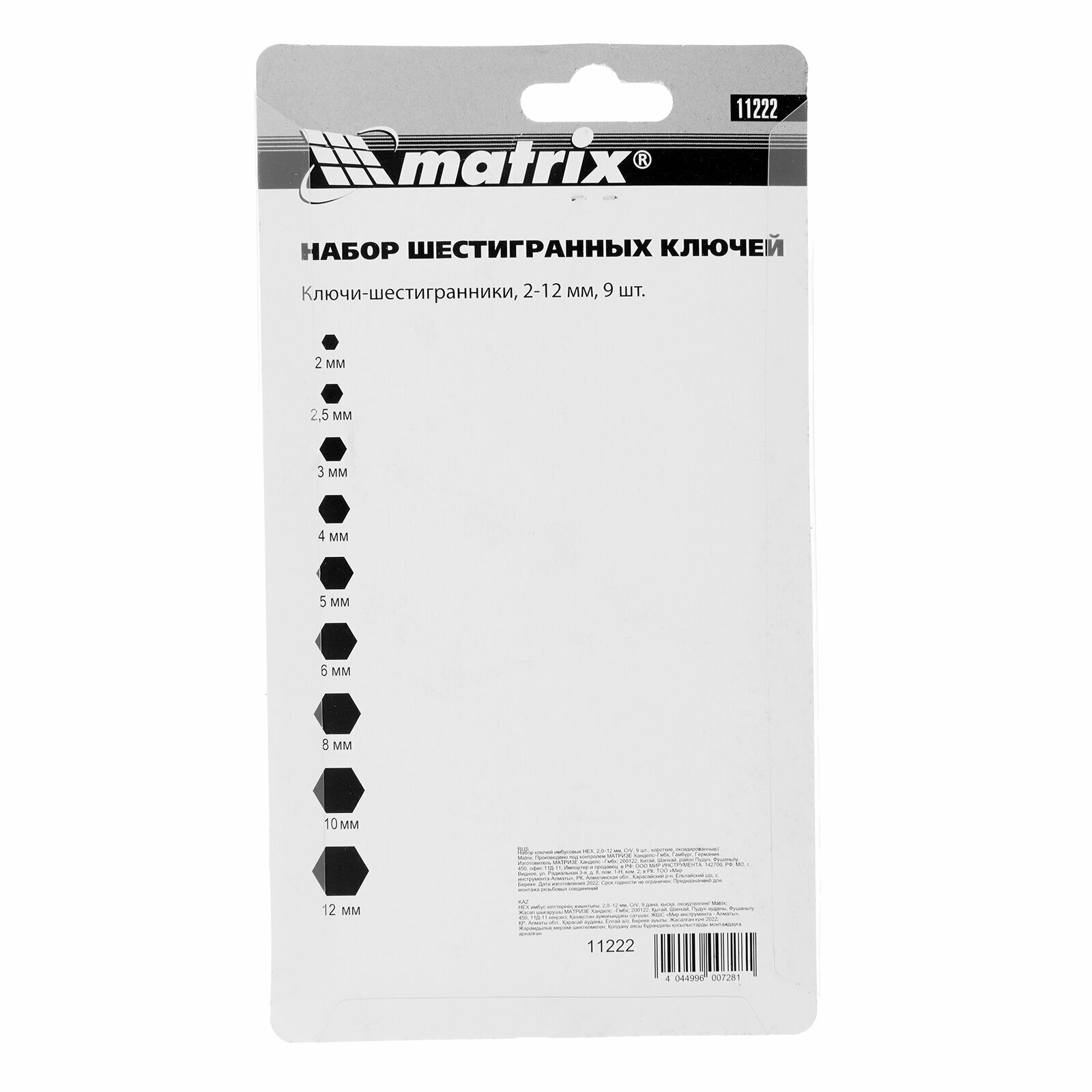 Набор ключей шестигранный, 9 предметов, Matrix, 2-12 мм, 11222