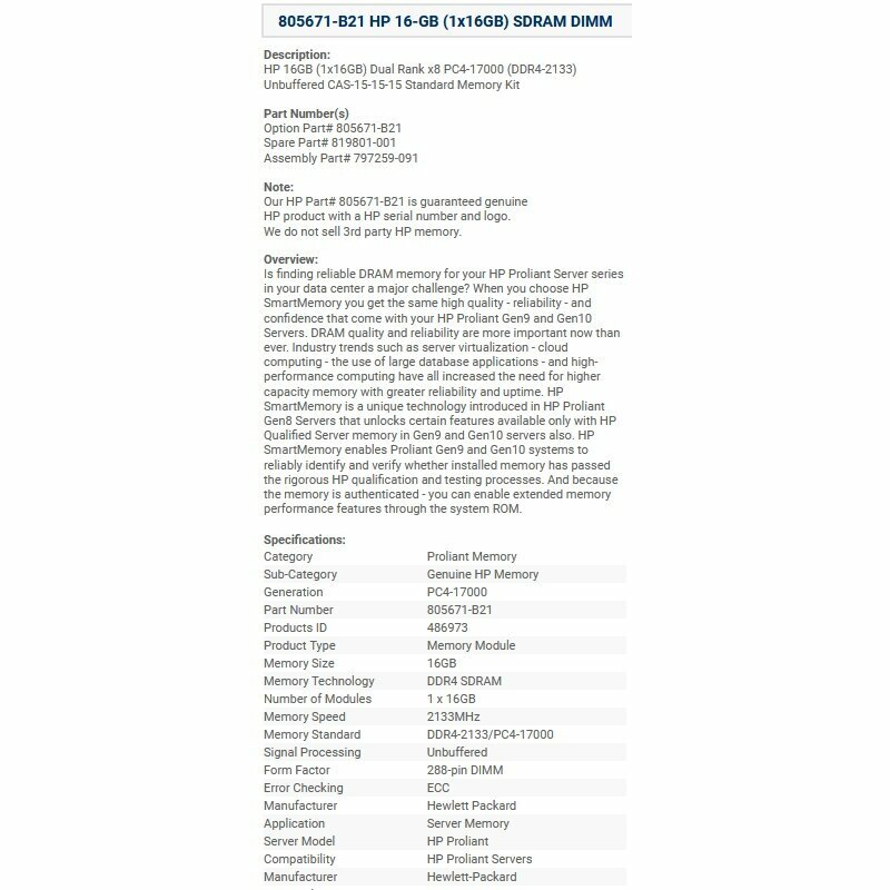 Оперативная память HP 805671-B21 16GB 2133MHz DIMM серверная 819801-001 797259-091 DDR4 PC4-17000 CAS-15 Unbuffered Dual Rank для G9 интересное: