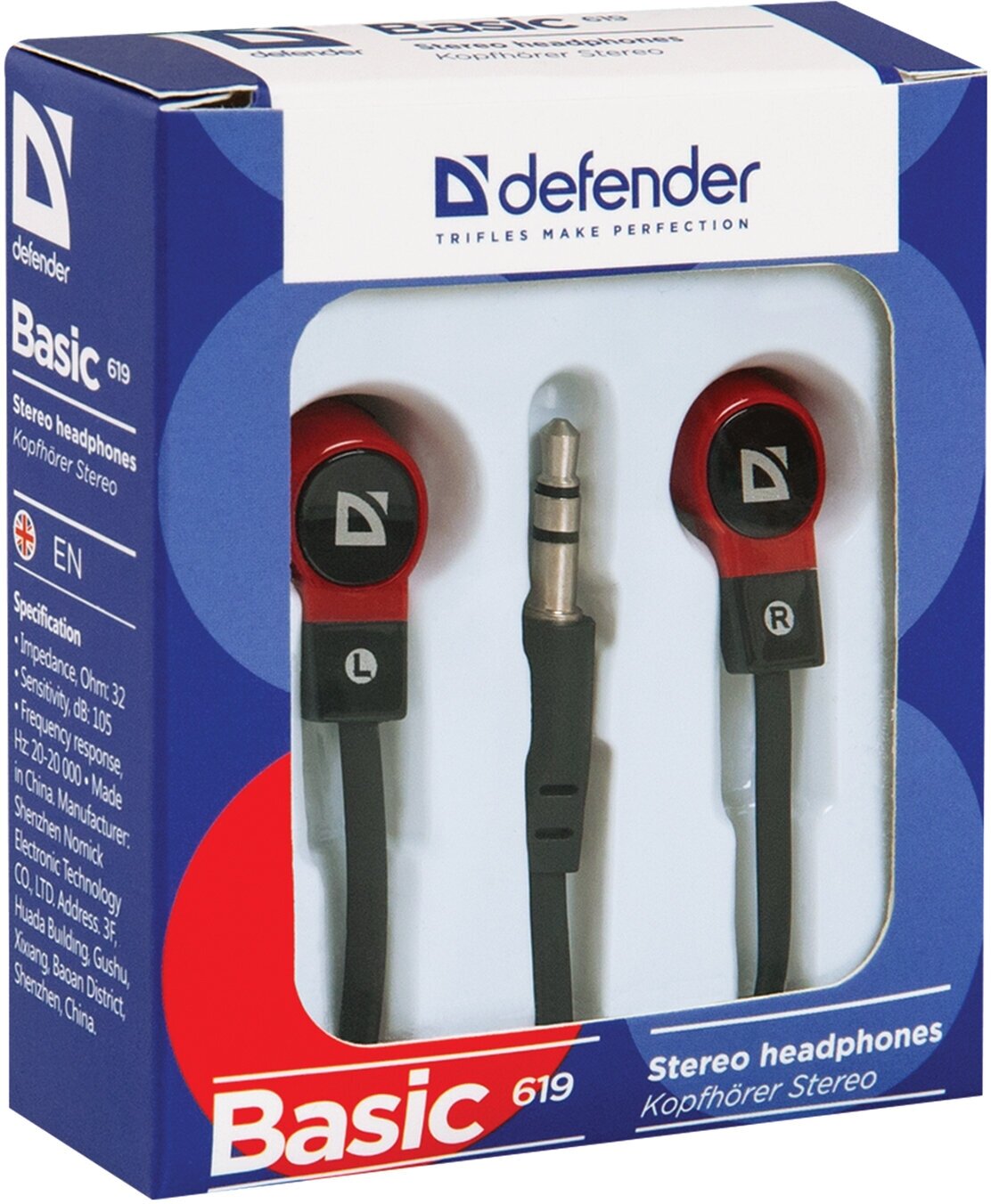 Проводные наушники внутриканальные Defender Basic-619 Jack 3.5 из пластика, цвет черно-красный, 1 шт