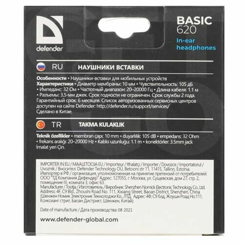 Наушники Defender Basic-620, вкладыши, чёрный
