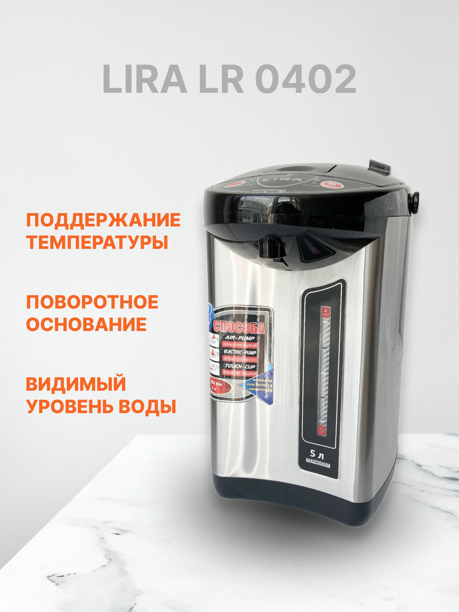 Термопот электрический "LIRA" LR 0402 (нержавеющая сталь, объем 5лит, 800Вт)