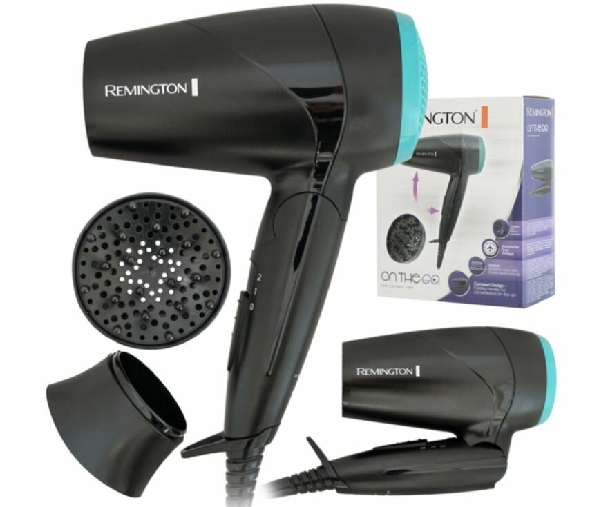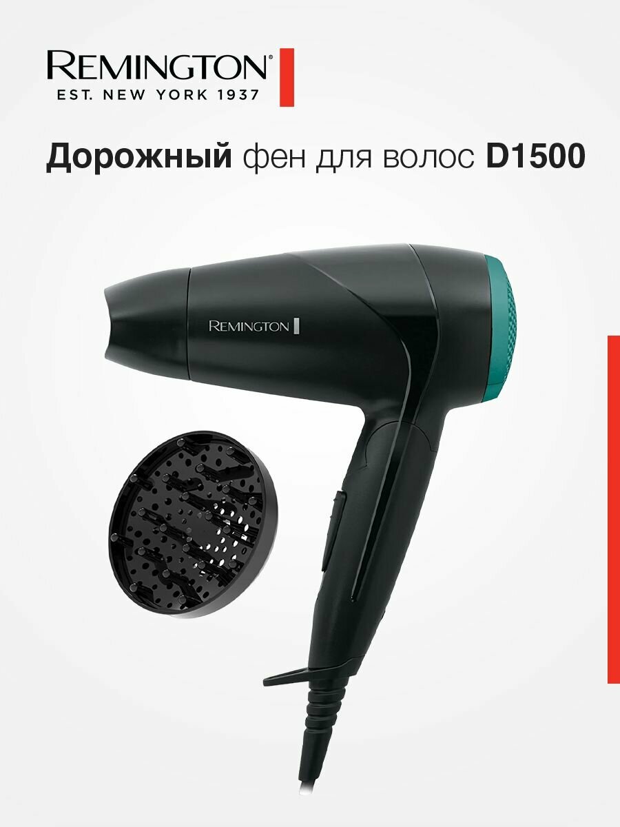 Купить Фен для волос Remington On The Go D1500, дорожный, 2000 Вт, 2 режима скорости/температуры, складная ручка, международное напряжение, черный