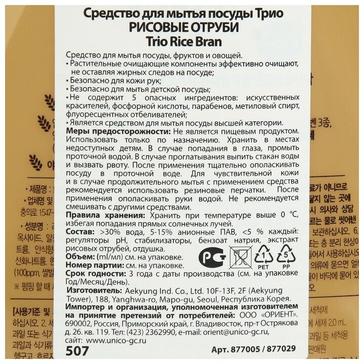 Средство для мытья посуды трио, рисовые отруби, 750 мл