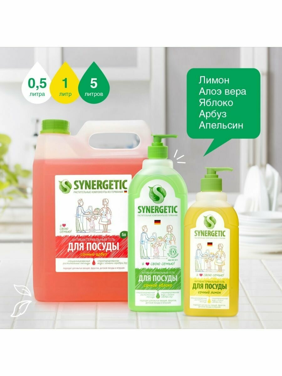 Средство для мытья посуды SYNERGETIC Сочный лимон 1 л антибактериальное, гипоаллергенное, биоразлагаемое, эко, моющее