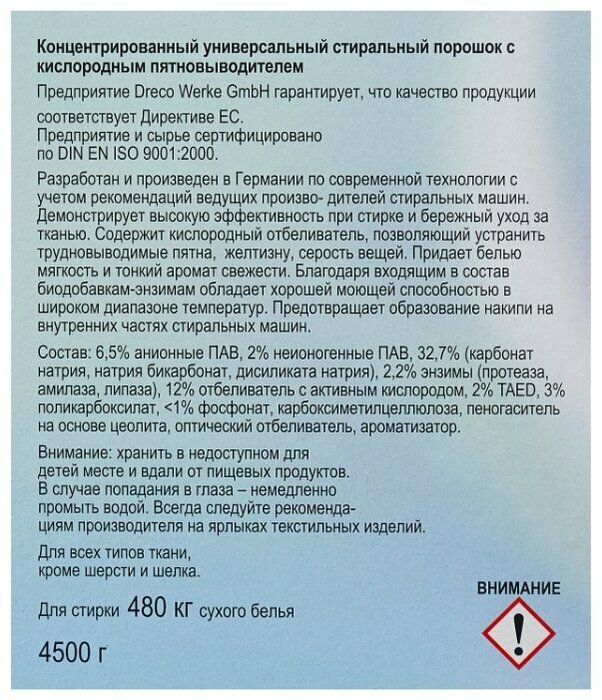 | Минусы: | В описании не было указана температура применения, для кипячения порошок не подходит, используется до 60 гр. с белым бельём. |