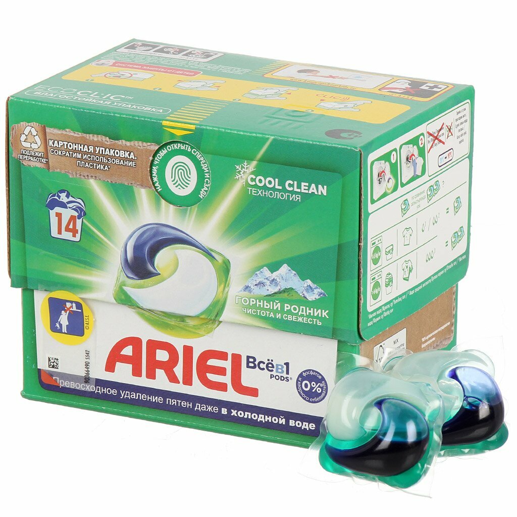 Капсулы для стирки Ariel Все-в-1 Горный родник, 14шт
