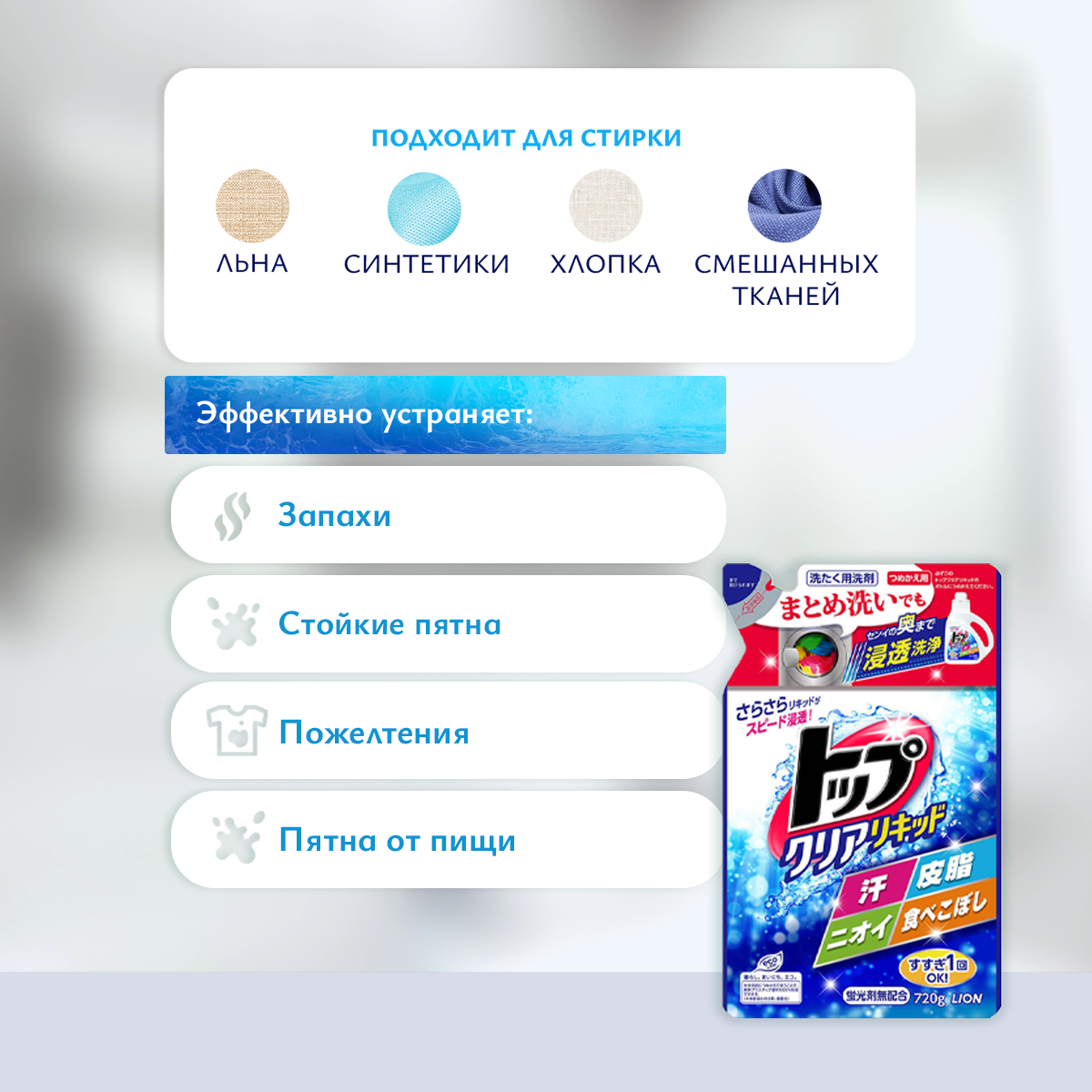 Lion Top Clear Liquid Жидкое средство для стирки белья, сила ферментов, мягкая упаковка, 720 гр