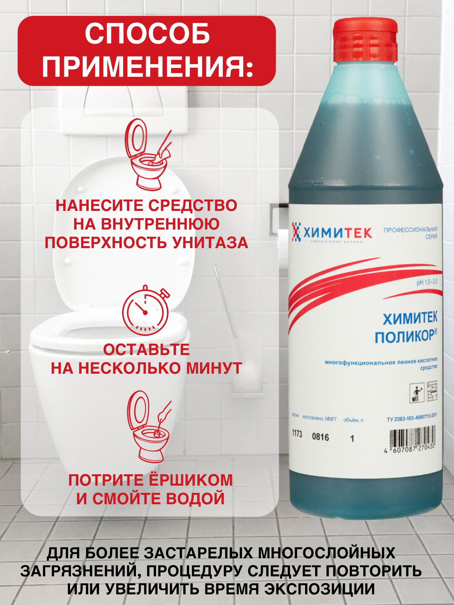 Средство для уборки сантехнических блоков, для чистки акриловых и стальных ванн, душевых кабин, сантехники для удаления известкового налёта, ржавчины Химитек Поликор - гель 1л, кислотное, гипоаллергенное, пенное, концентрат, профессиональная серия